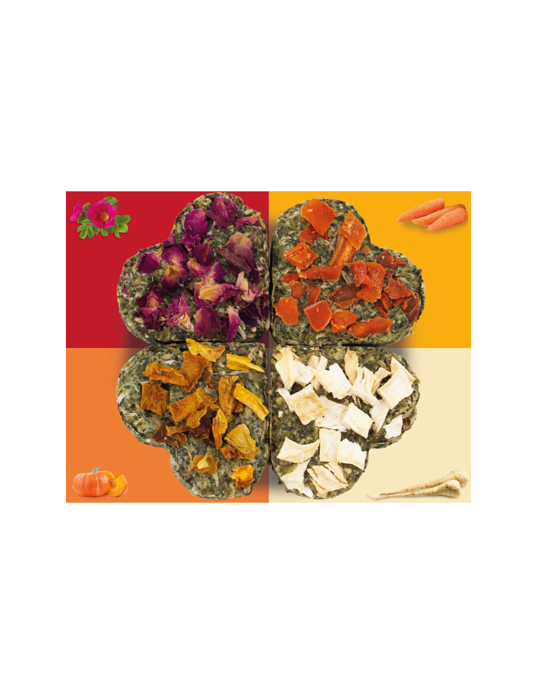 Skład: groch, nasiona traw, nasiona traw kanaryjskich, marchew 5.3%, pokrzywa, gryka, dynia 3.2%, pasternak 3.2%, pietruszka, nasiona konopi, siemię lniane, nasiona kopru włoskiego, mięta pieprzowa, mniszek lekarski, czarnuszka, kwiat róży 0.4%
