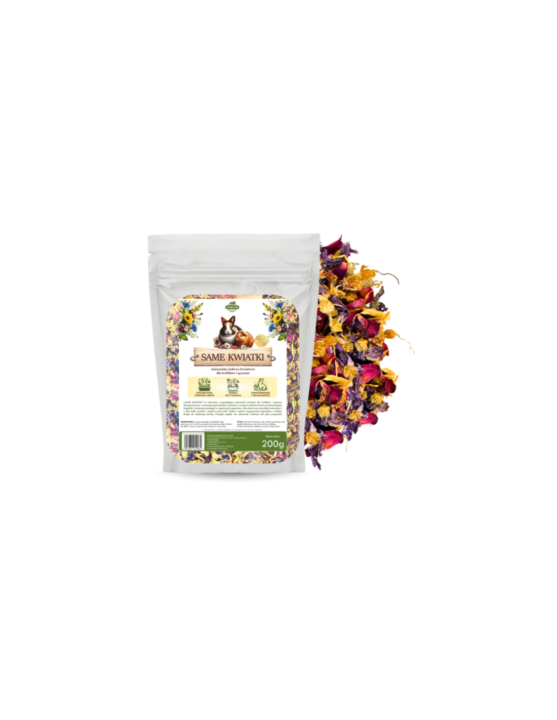 Mieszanka kwiatowa Same Kwiatki została skomponowana z suszonych kwiatów o wyjątkowych właściwościach, które wspierają zdrowie i samopoczucie królików i gryzoni. Starannie dobrane składniki dostarczają cennych substancji odżywczych, wspierają trawienie, działają łagodząco i wzmacniają odporność. Mieszanka zawiera: