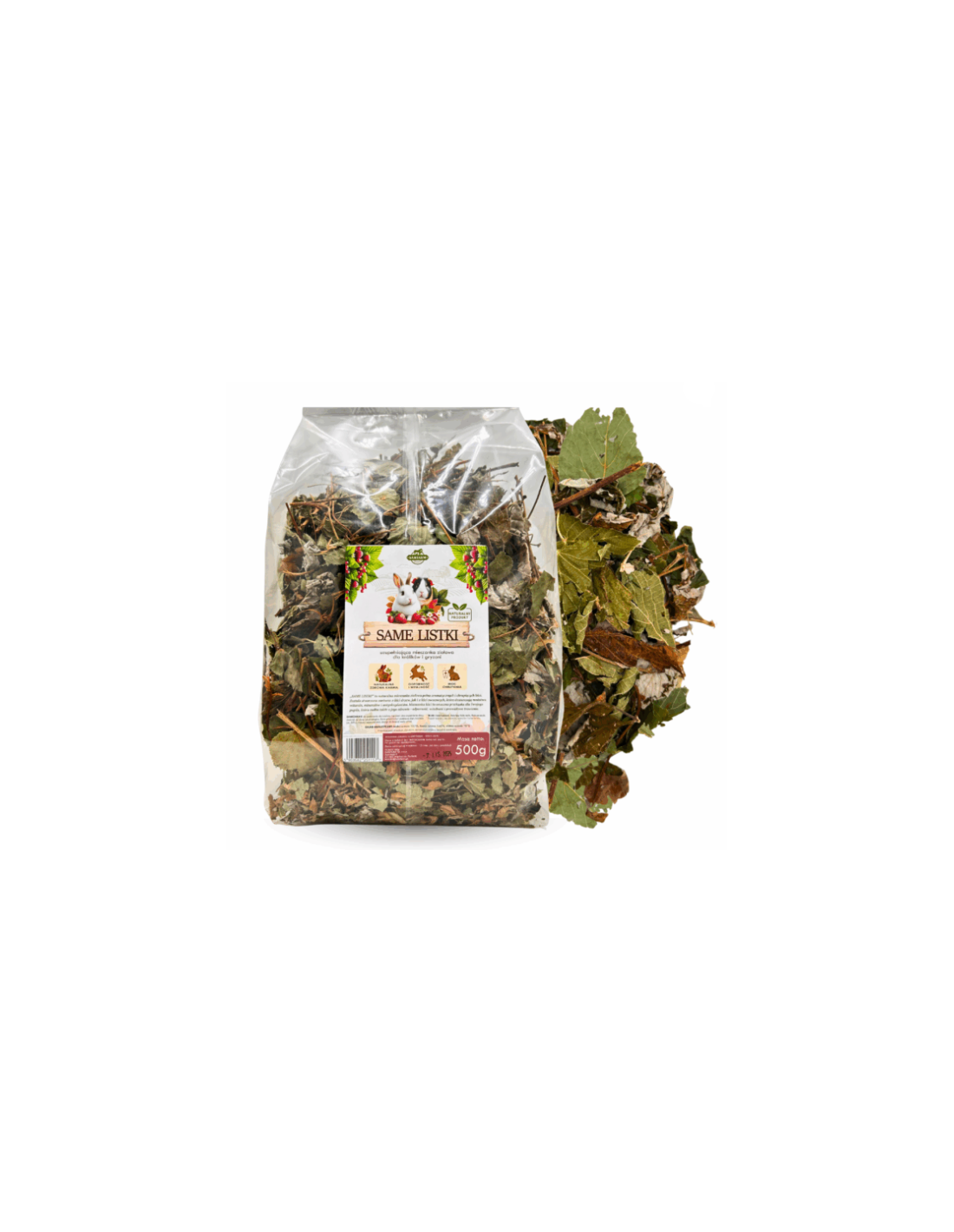 Mieszanka ziołowa Same Listki to kompozycja liści truskawki, malin, porzeczki i lipy, pełna naturalnych witamin, minerałów i antyoksydantów, które wspierają odporność, witalność i ogólną kondycję królików i gryzoni.