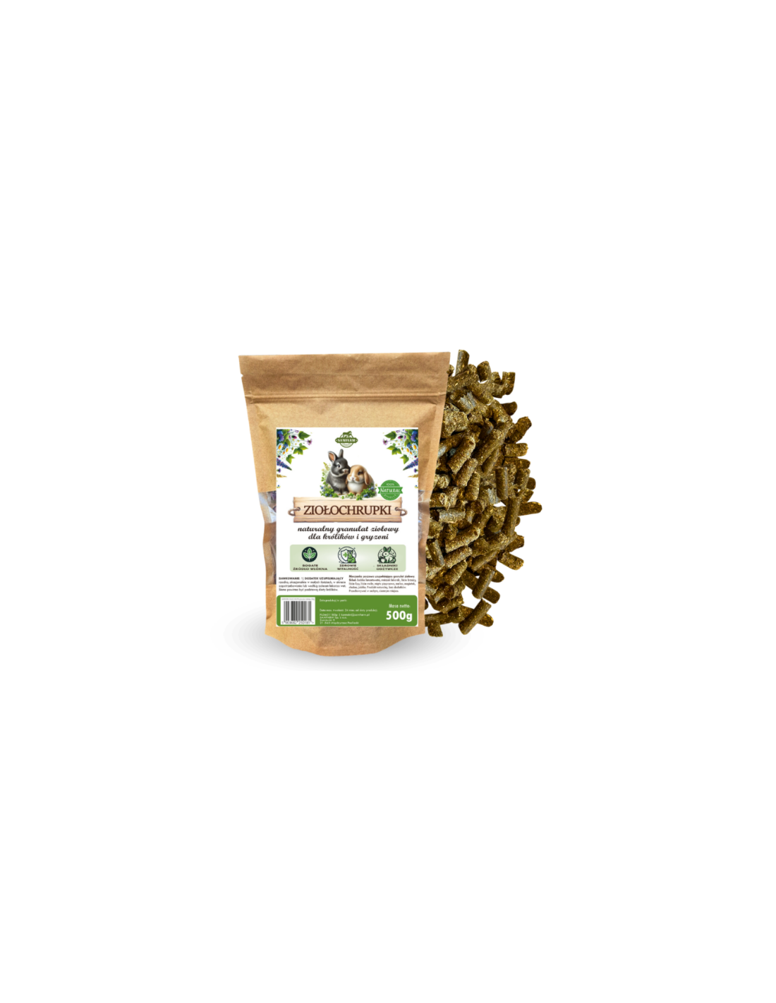 Ziołochrupki to naturalna karma uzupełniająca, stworzona z myślą o codziennym wsparciu zdrowia i dobrej kondycji królików. W 100% roślinny skład oparty na ziołach, liściach, kwiatach i jabłku czyni z niej pyszną i zdrową przekąskę, która idealnie dopełnia podstawową dietę.